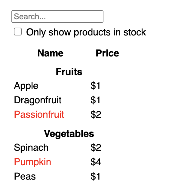 Nếu bạn nhìn vào ProductTable (màu oải hương), bạn sẽ thấy rằng phần tiêu đề (chứa nhãn “Name” và “Price”) không phải là một thành phần riêng của nó. Điều này là vấn đề về sở thích, và bạn có thể chọn cách nào tùy ý. Đối với ví dụ này, nó là một phần của ProductTable vì nó xuất hiện bên trong danh sách của ProductTable. Tuy nhiên, nếu phần tiêu đề này trở nên phức tạp hơn (ví dụ: nếu bạn thêm chức năng sắp xếp), bạn có thể chuyển nó vào thành phần riêng của nó là ProductTableHeader.